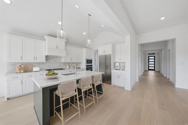 Gorgeous 1-Story Gem Backing to a Greenbelt – A Must See! Don’t miss this stunning single-story home with 4 bedrooms, 3 full baths, a study, and a media room — all thoughtfully designed with high-end finishes and exceptional functionality. The elegant brick exterior with stone accent and a rare 3-car garage give this home serious curb appeal. Step inside to a grand 12-ft entry hallway, rich engineered wood flooring in main areas, and an oversized family room with a cozy gas fireplace and picture windows overlooking the greenbelt. The kitchen is a showstopper, featuring quartz countertops, custom wood vent hood, pot & pan drawers, trash can pull-out, gas cooktop, Energy Star stainless appliances, and a massive walk-in pantry — perfect for any home chef! The luxurious layout is rounded out by patterned carpet with upgraded padding in the bedrooms and plenty of natural light throughout. You’ll love the peaceful, scenic setting and beautiful backyard views. Located in Devonshire, a premier master-planned community loaded with amenities, walking trails, water features, and year-round events. Plus, you're just minutes from shopping, dining, and exciting new additions like Costco, H-E-B, Super Target, and Home Depot coming soon! This home checks every box — come see it in person before it’s gone!