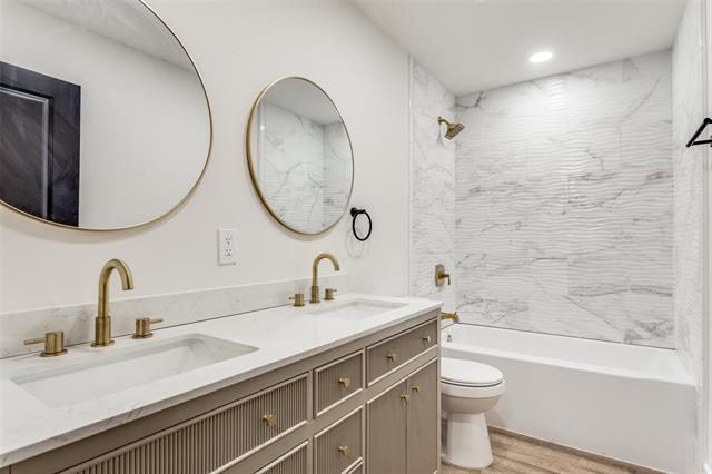 All three bedrooms are generously sized, while both full bathrooms feature double vanities and updated fixtures for a spa-like feel.
