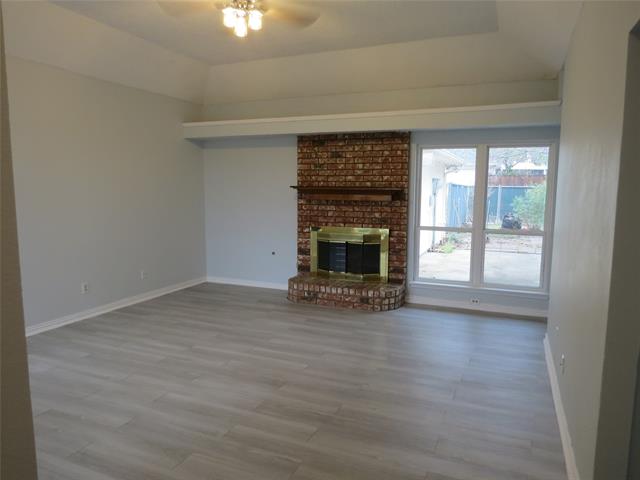 The living area offers a warm and inviting atmosphere featuring rich laminate flooring and a cozy brick fireplace, perfect for family gatherings.