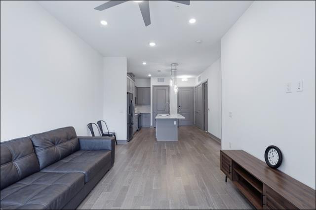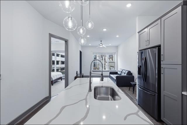 The modern kitchen is designed to impress, featuring quartz countertops and an oversized island that anchors the space beautifully. The private bedroom offers a spacious walk-in closet with built-in shelving and effortless access to the full bath, blending comfort with thoughtful design.