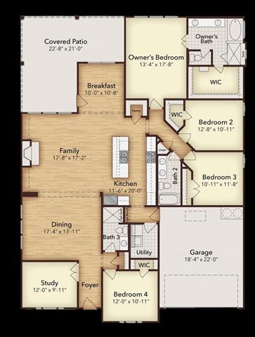 MLS# 21084108 - Built by Kindred Homes - Ready Now! ~ Monthly Payment: $2,970.03* - see termsMeet the Agave plan, a spacious 2,484 sq ft, one-story home featuring a stunning stone elevation and brick exterior. Inside, the open-concept layout includes a beautiful kitchen with dark cabinets and white quartz countertops, flowing into the family room with a cozy fireplace. The study off the main entry is perfect for working from home, and the large dining room offers space for family gatherings. The owner's suite boasts dual vanities, a walk-in shower, a soaking tub, and a large walk-in closet. With wood-like flooring throughout, an extended covered patio perfect for entertaining, and sizeable secondary bedrooms, this home has it all.