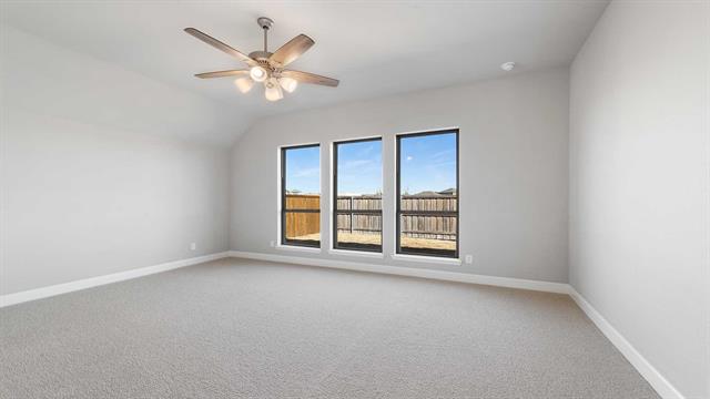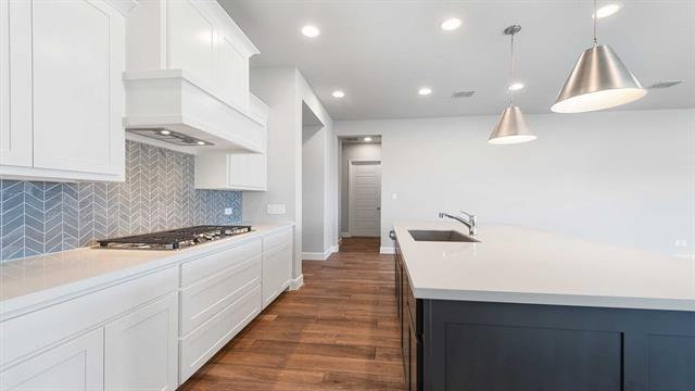 MOVE IN READY! Step off the front porch into an extended entry with soaring 12-foot ceilings, where a private home office sits just off to the side. The entryway flows into the open-concept kitchen, dining area, and family room. The kitchen boasts a corner walk-in pantry, generous counter space, a 5-burner gas cooktop, and an island with built-in seating. The dining area seamlessly connects to the family room, highlighted by a wall of windows, a wood mantel fireplace, and access to the covered backyard patio. The primary suite with a double-door entry leading to the bath featuring dual vanities, a garden tub, a separate glass-enclosed shower, and two spacious walk-in closets. A private guest suite with its own bath enhances this one-story home’s thoughtful layout. Completing the design are a mud room and a two-car garage.