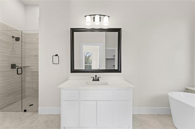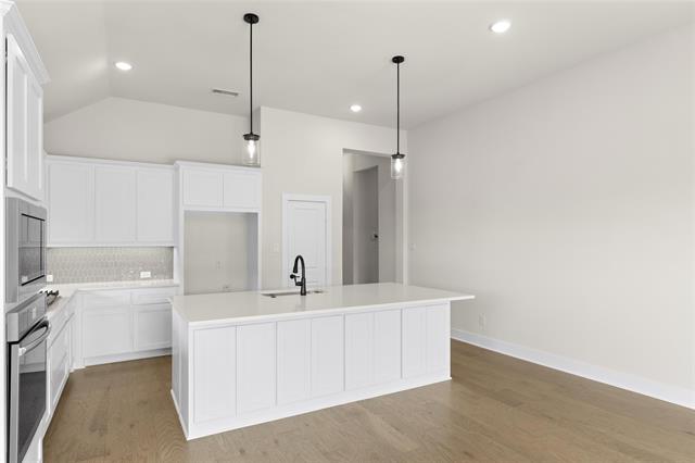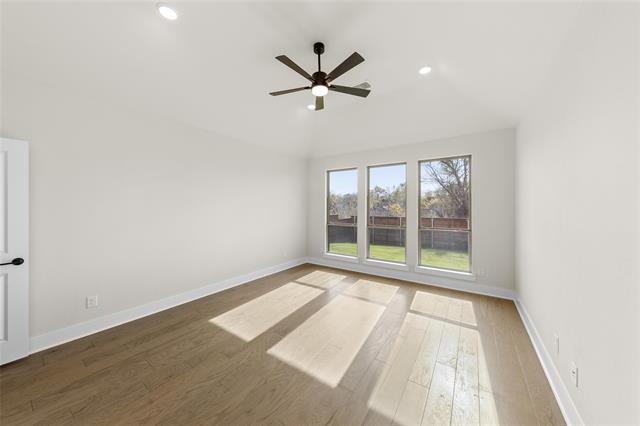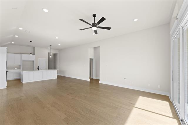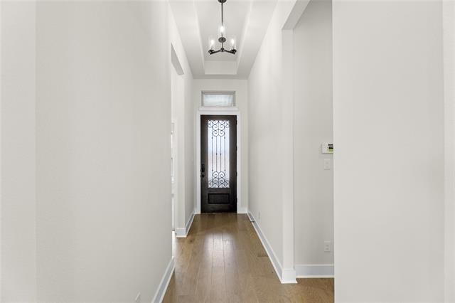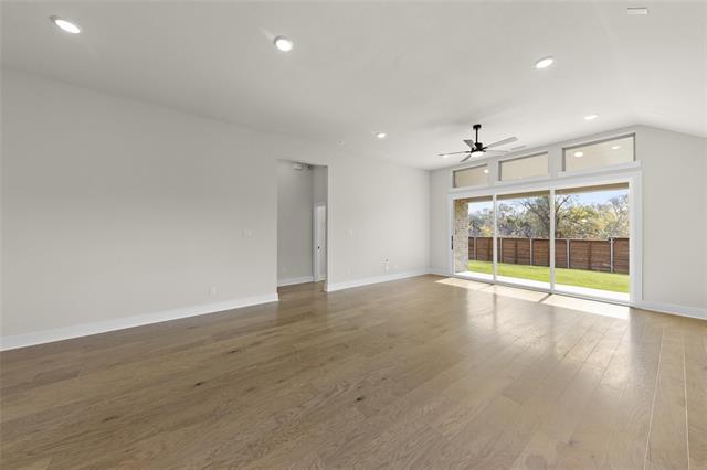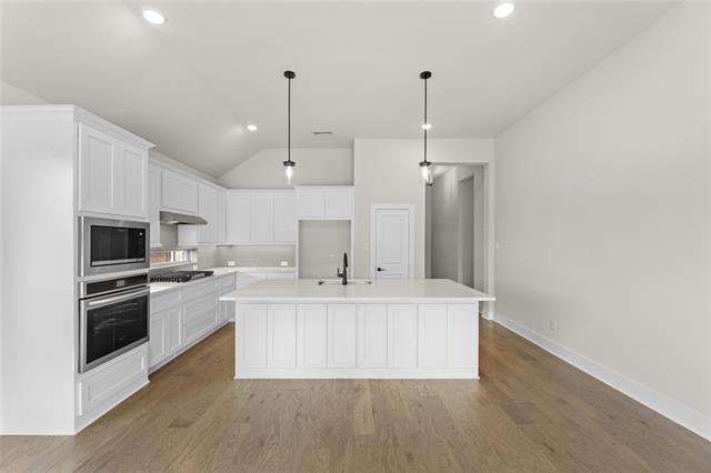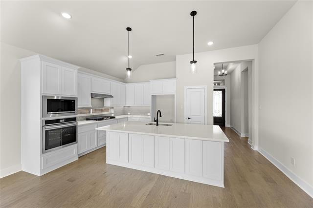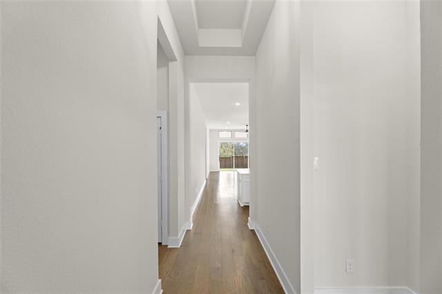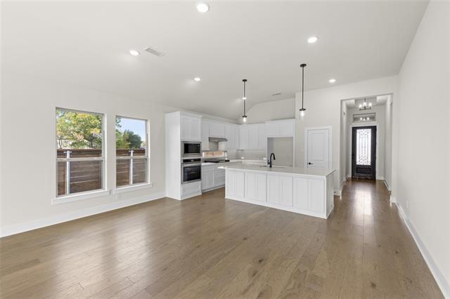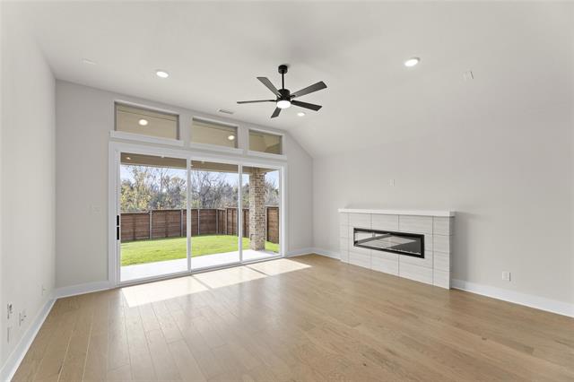 MLS# 20747071 - Built by First Texas Homes - Ready Now! ~ Single-story home with an open floor plan boasting numerous upscale upgrades including built-in appliances, quartz countertops, and hardwood floors throughout. Sliding glass doors open to a covered patio, offering serene greenbelt views. The expansive primary suite is a haven of modern luxury with continuous hardwood flooring, quartz countertops, and a soothing freestanding bathtub. The family room is highlighted by a striking 60-inch linear fireplace, enhancing the overall charm and warmth of the space.