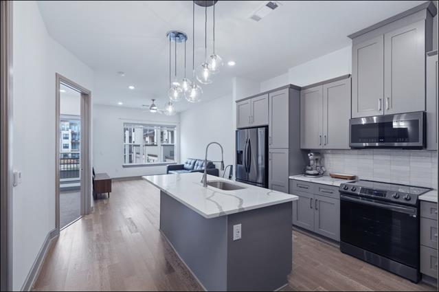 The modern kitchen is designed to impress, featuring quartz countertops and an oversized island that anchors the space beautifully. The private bedroom offers a spacious walk-in closet with built-in shelving and effortless access to the full bath, blending comfort with thoughtful design.
